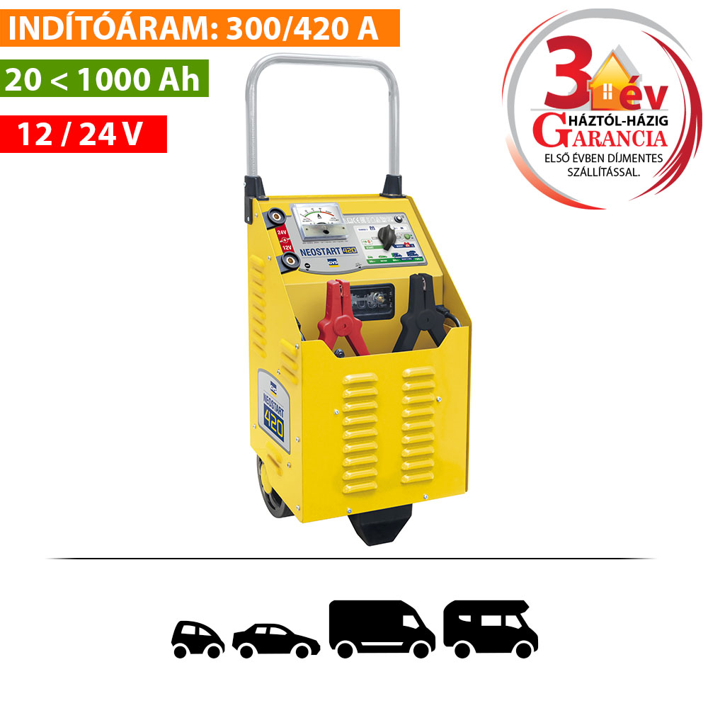 A Neostart 420 készülék folyékony elektrolittal töltött 20 Ah - 1000 Ah kapacitású, 12 V-os és 24 V-os ólomakkumulátorok töltésére alkalmas. Ez a készülék hagyományos akkumulátortöltő, a feltöltöttségi szintet figyelni kell rajta.