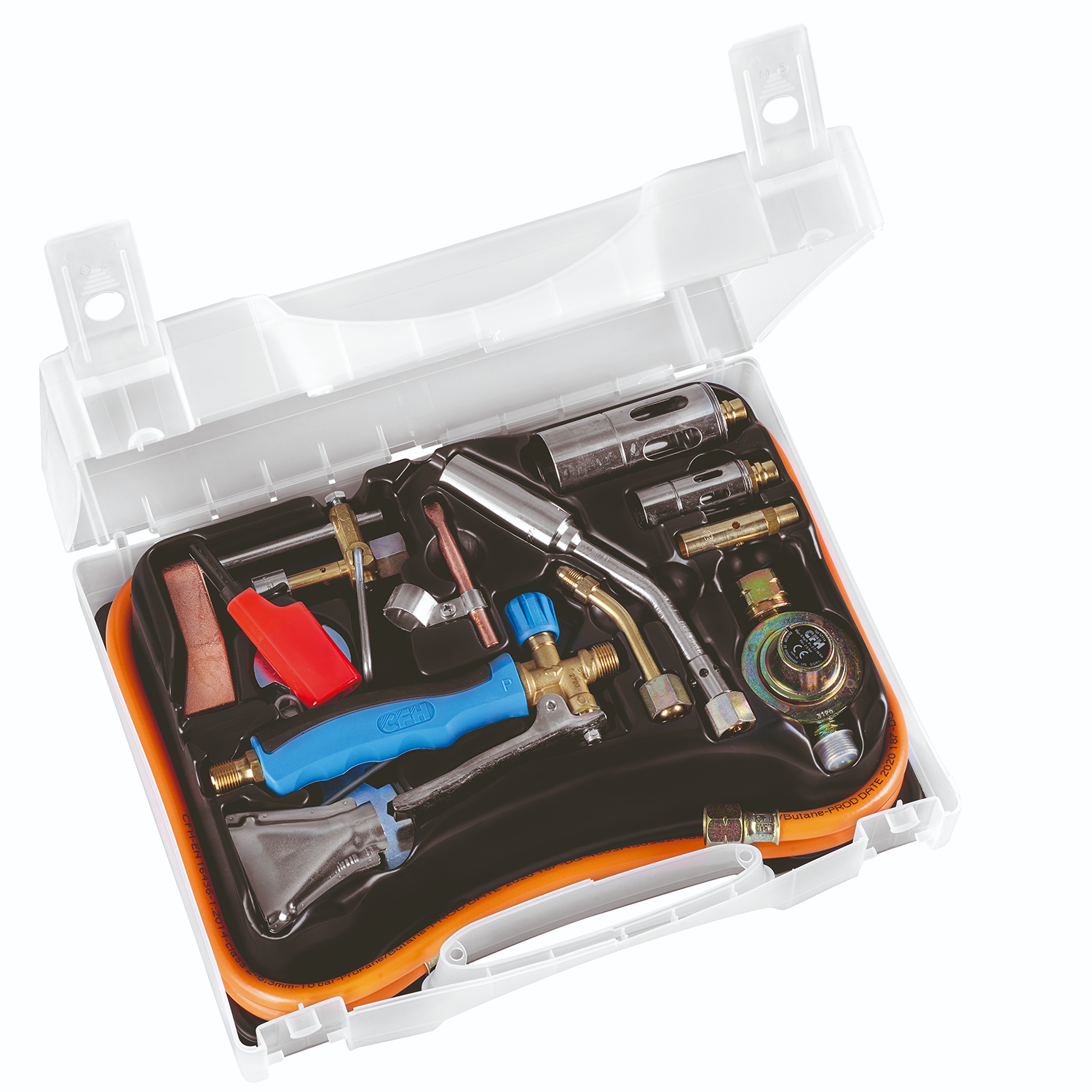 - Takarékláng-kapcsolós fogantyú az energiafelhasználás csökkentésére, égőrész levehető 230 g-os rézdarabbal, forrasztópákafeltét 100 g-os rézdarabbal, szélesforrasztó, 2.5 bar nyomásszabályozó, gáztömlő piezogyújtással.